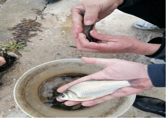 調研組一行主要走訪了沅江市鯽魚主養區黃茅洲鎮,在衛星湖漁場和三聯湖漁場,調研組深入合方鯽養殖塘邊,跟養殖戶進行了細致深入的交流,詢問養殖面積、養殖數量、生長速度、抗病情況和養殖戶對合方鯽2號這個品種的看法。這兩個漁場都是今年5月份才開始從事合方鯽2號養殖,走訪的養殖戶一致表示,合方鯽2號是一個非常優秀的養殖品種,成活率高,生長速度快,抗病性強,體型體色非常好看,從水花下塘到現在三個月時間,個體已經達到了去年別的鯽魚苗種一年生長的大小,套養到精養塘的合方鯽2號鯽苗種已經有一兩多了,估計年底能夠達到6-8兩,可以上市。調研組一行現場從苗種塘和套養塘隨機起捕了少量合方鯽2號查看,合方鯽2號長勢均勻,游動活潑有力,體色均勻亮麗,苗種塘規格35-40g,套養塘規格65-70g。