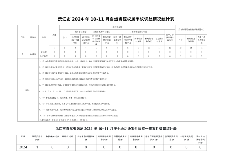 沅江市2024年10-11月自然資源權屬爭議調處情況和涉土糾紛案件法院一審案件統計表