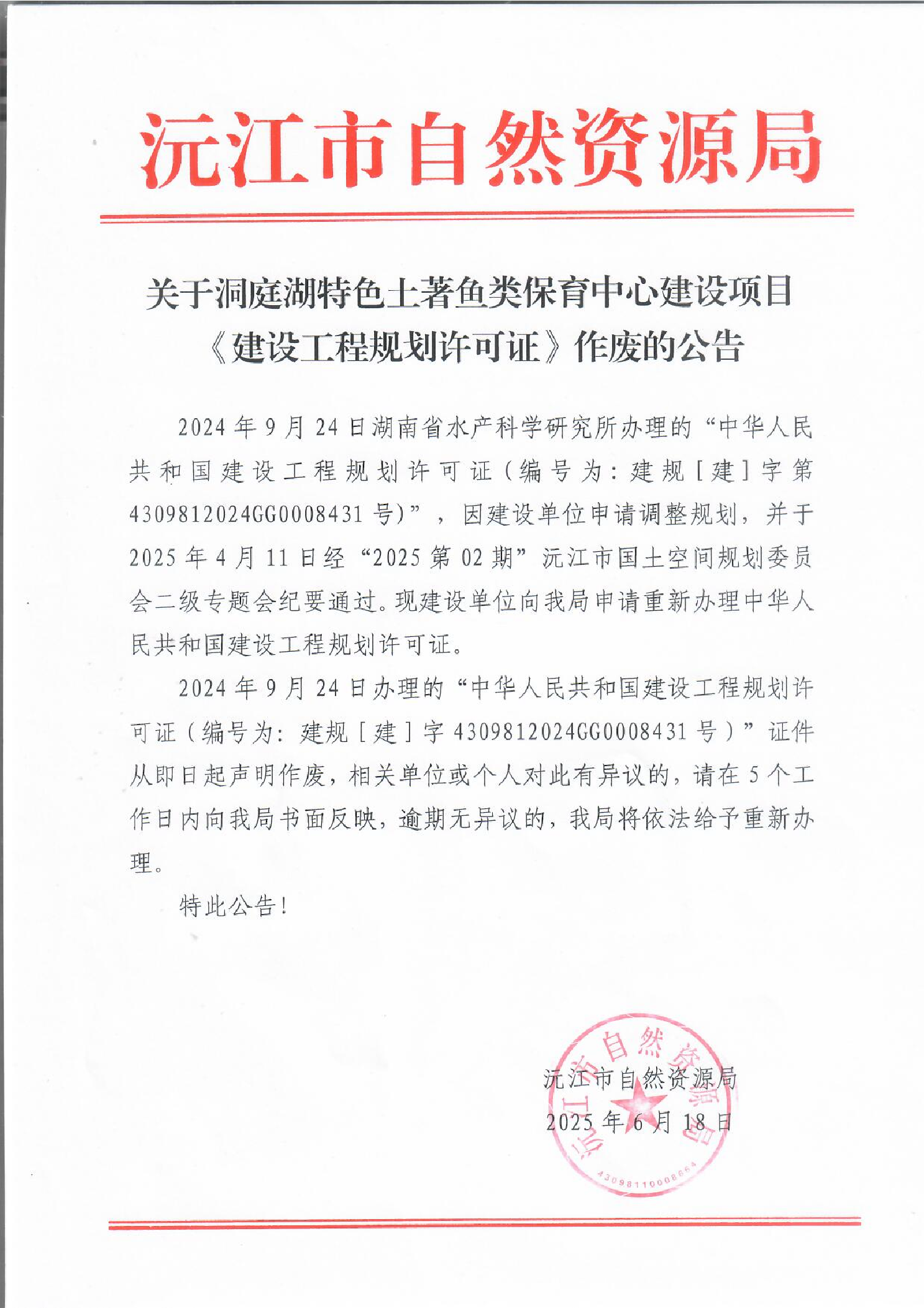 關(guān)于洞庭湖特色土著魚類保育中心建設(shè)項(xiàng)目《建設(shè)工程規(guī)劃許可證》作廢的公告