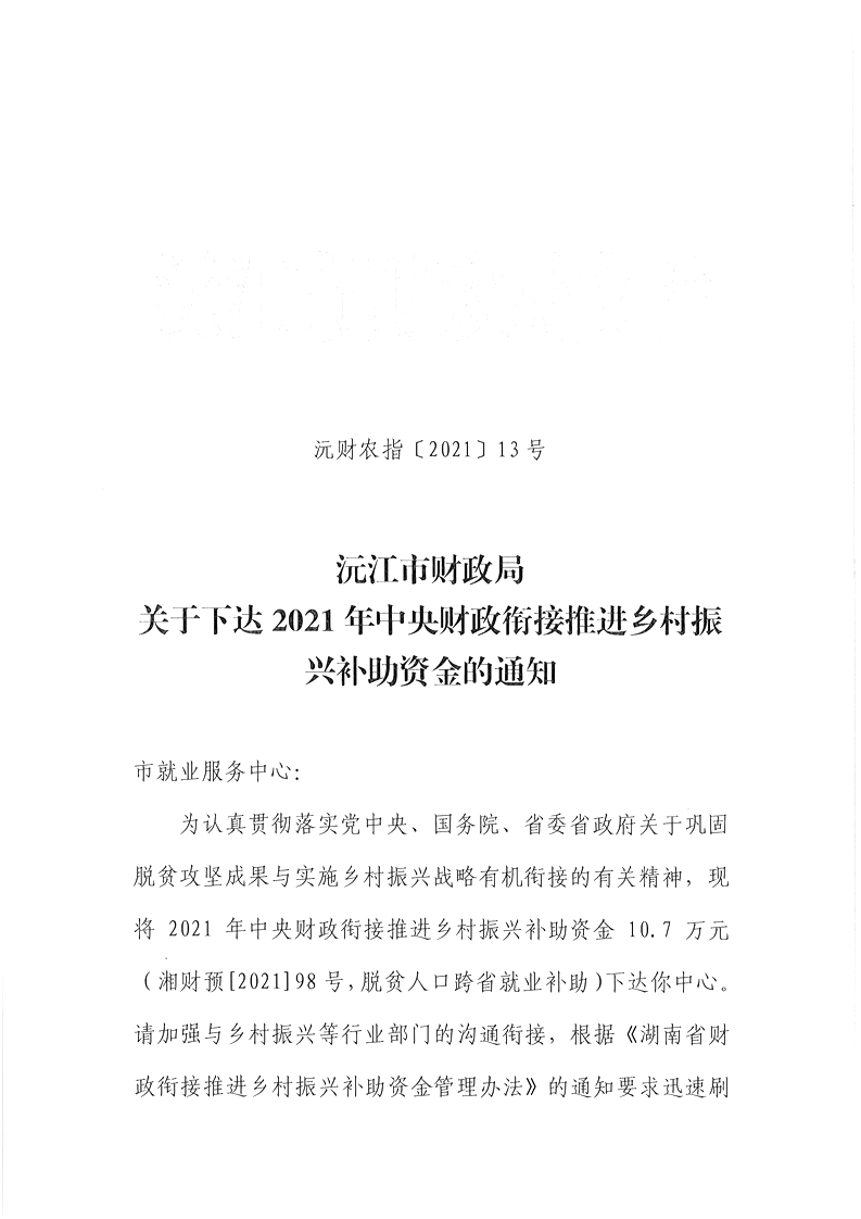 沅財農(nóng)指【2021】13號 沅江市財政局關(guān)于下達2021年中央財政銜接推進鄉(xiāng)村振興補助資金的通知