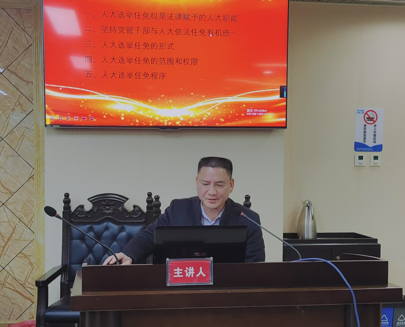 鐘先貴從人大選舉任免的意義、基本原則、形式、范圍和權限、程序五個方面進行了介紹和說明。趙軍洪認為本次講課內容詳實,使與會人員對選舉任免工作有了更為清晰的認識和理解。他強調,人事任免權是憲法和法律賦予人大常委會的一項重要職權。人大干部要正確理解和把握人大常委會人事任免權的種類和適用范圍,嚴格落實人事任免法定程序,彰顯人大任命的嚴肅性、權威性;要做實任后監督,提升任后監督實效,切實增強受任人員責任感、使命感。