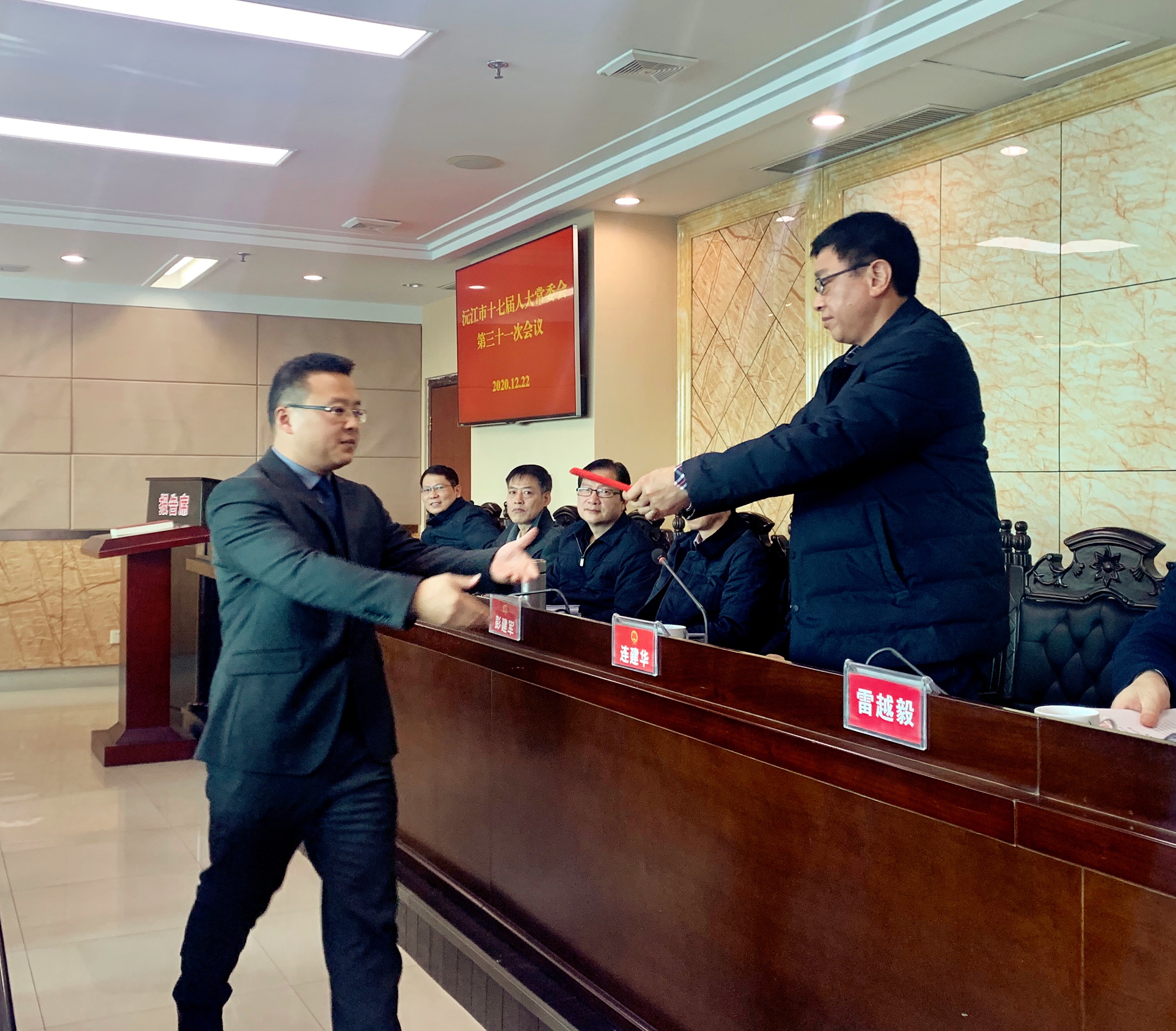 12月22日,市十七屆人大常委會第三十一次會議召開。市人大常委會主任連建華,副主任彭建軍、王毅、傅德華、李志文、周新秋,市人大常委會組成人員出席會議。會議由李志文主持。市人大常委會黨組書記、主任提名人選雷越毅,黨組成員、副主任提名人選譚洪祥、趙軍洪,市委常委、市人民政府常務副市長丁曉明,市人民法院院長鄒兆洲,市人民檢察院檢察長提名人選劉德芳列席會議。