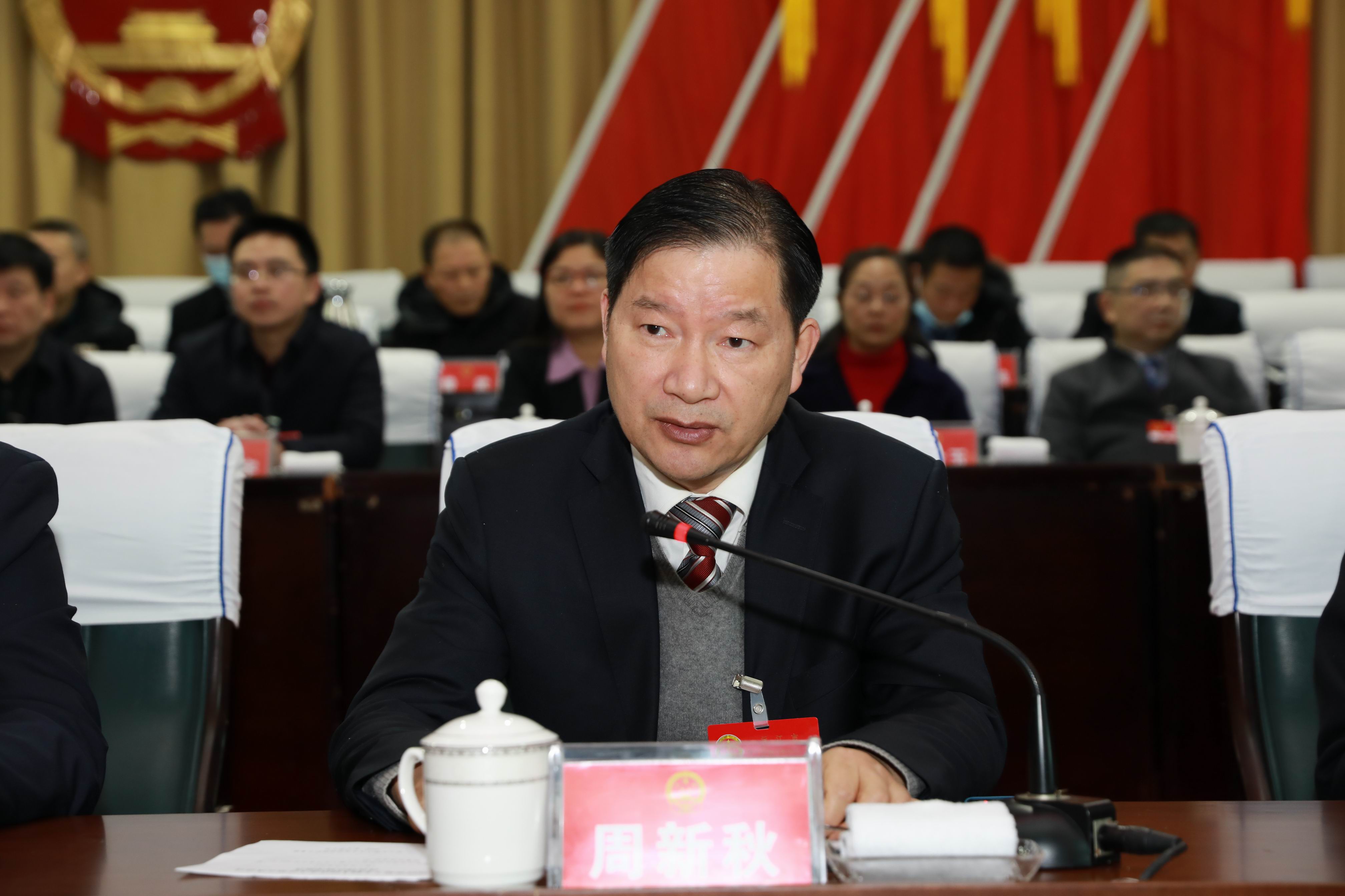 擔(dān)任本次會議執(zhí)行主席并在前排就座的是黃育文、雷越毅、李志文、周新秋、譚洪祥、趙軍洪、彭江林、李建國、甘建華、劉愛萍、曹建華、羅紅麗、郭鎮(zhèn)彪。在主席臺就座的還有楊智勇、羅必勝、李益、龍旺宇及大會主席團(tuán)成員。