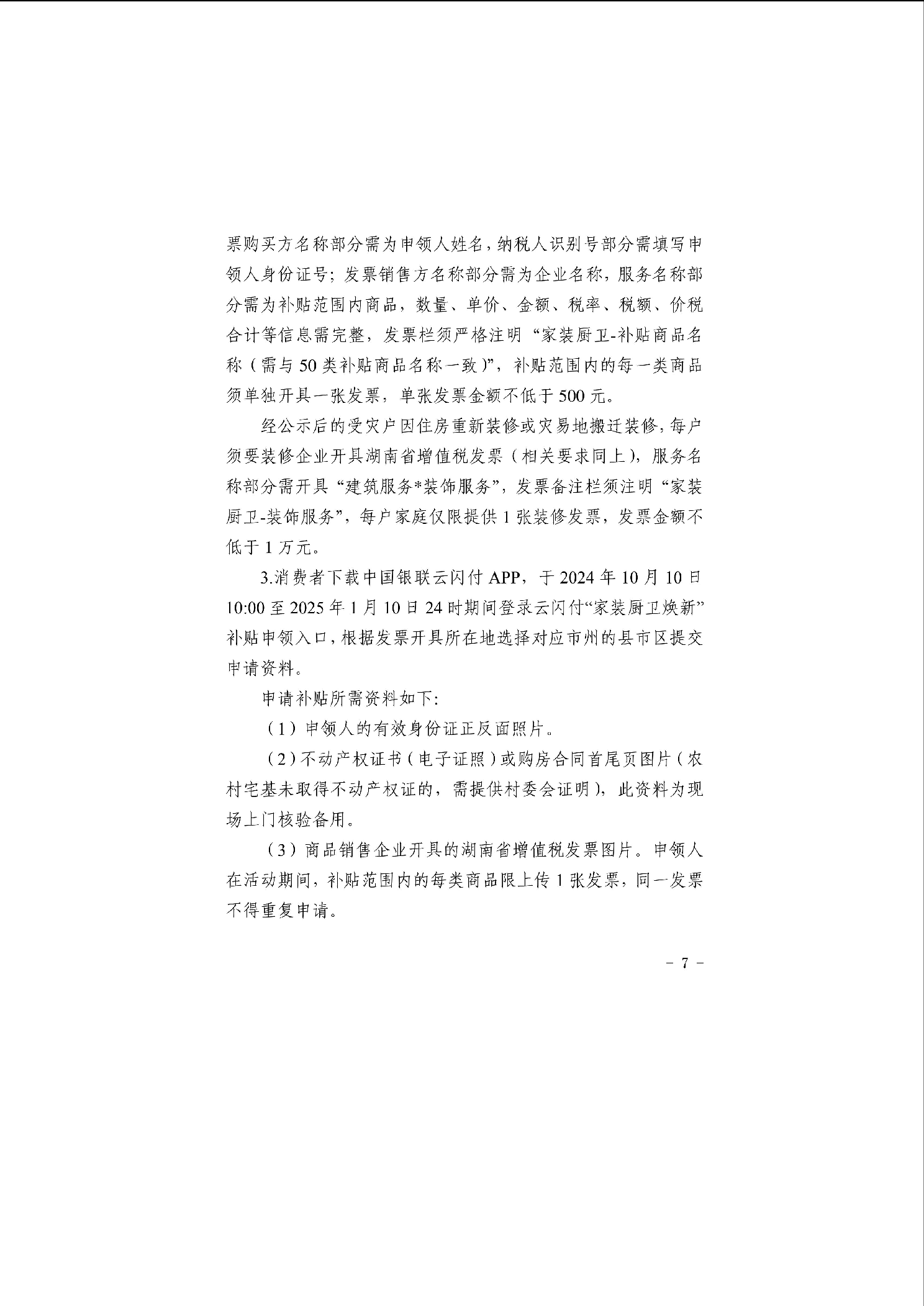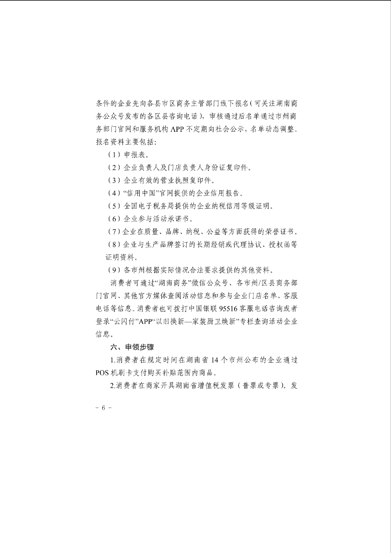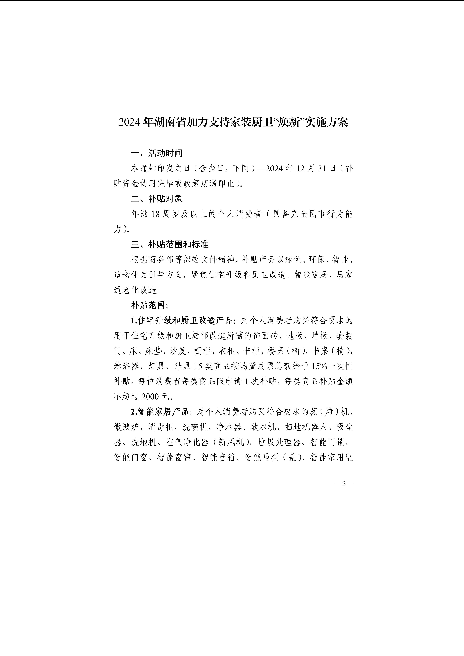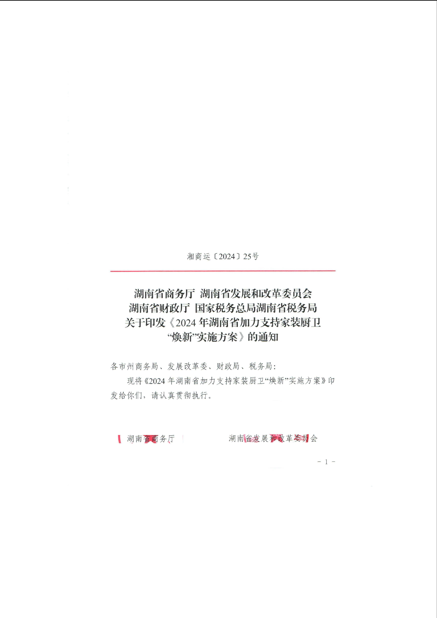 轉(zhuǎn)發(fā): 湖南省商務(wù)廳湖南省發(fā)展和改革委員會(huì) 湖南省財(cái)政廳國(guó)家稅務(wù)總局湖南省稅務(wù)局 關(guān)于印發(fā)《2024年湖南省加力支持家裝廚衛(wèi) “煥新”實(shí)施方案》的通知