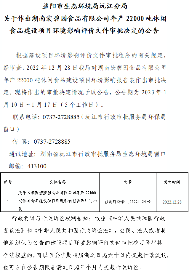 關于作出湖南宏碧園食品有限公司年產22000噸休閑食品建設項目環境影響評價文件審批決定的公告