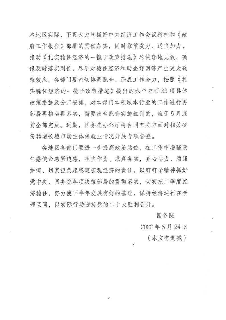 國務院關于印發扎實穩住經濟一攬子政策措施的通知