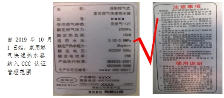 1.家用燃氣熱水器應有CCC標志和能效標識;