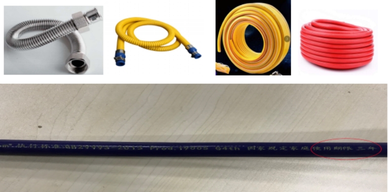 燃氣具連接用軟管,是用于家用燃氣具出口與用戶燃氣燃燒器具連接用的軟管。根據材料不同分為:金屬(波紋)軟管和非金屬(橡膠或橡塑復合)軟管。依據GB55009-2021《燃氣工程項目規范》,從2022年1月開始,居民家中不得使用常用的老式燃氣膠管,老式燃氣膠管容易被老鼠咬破,且使用年限無法滿足相關要求。橡膠或橡塑軟管上連續長度每隔300mm或單根軟管應標注:產品名稱、規格、制造商名稱或縮寫、產品標準號、制造季度和年份、使用期限等內容。(見圖5)