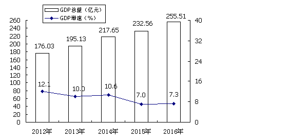 經濟總量上新臺階初步核算,2016,全實現地區生產總值GDP255.51億元,比上年增長7.3%。其中:第一產業增加值57.17億元,增長3.6%第二產業增加值96.88億元,增長6.2%;第三產業增加值101.46億元,增長10.5%按年均常住人口測算,市人均GDP36998元,比上年增長6.8%三次產業結構由上年的22.239.238.6調整為22.437.939.7第三產業比重提高1.1個百分點,三次產業對經濟增長的貢獻率分別為10.9%33.3%55.8%