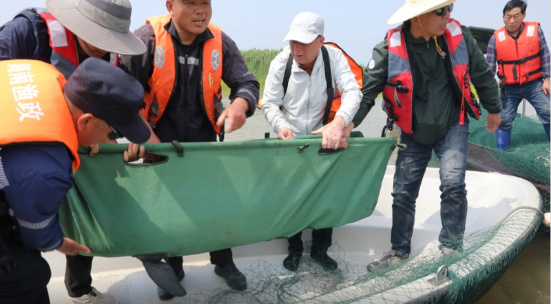 4月29日上午10時許,在沅江市南洞庭湖一處叫做萬子湖的水域,隨著當地漁政執法人員鄭陽春將尾鰭嚴重受傷的江豚穩穩托入擔架,一場持續48小時的生命救援行動圓滿落幕。