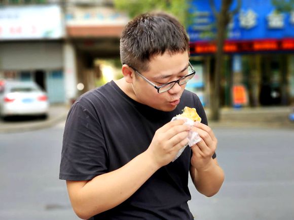 劉先生老吃貨深知熱月餅好吃的道理 在鐘師傅店門口一個個買了吃完才離去