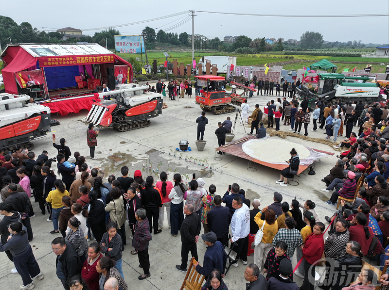 在沅江市保民村現(xiàn)代農(nóng)機(jī)專業(yè)合作社,人潮涌動(dòng),游人如織。人們耍起龍燈花鼓,跳起歡快的廣場(chǎng)舞,共同慶祝他們的豐收節(jié)。