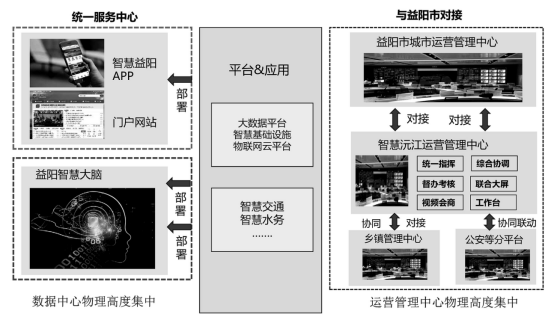 5、部署架構。在益陽市智慧城市建設“全市一盤棋”原則指導下,依托益陽市統籌安排下完善新沅江APP服務與沅江門戶網站,實現服務渠道的統一。數據中心方面,統一依托益陽市智慧大腦和沅江市信息中心網絡機房,除涉密等原因外,原則上沅江各部門不再新建或部署獨立運行的信息系統。規劃智慧城市運營管理中心,全市統建,承擔全沅江市運行管理工作的統一指揮、綜合協調、督辦考核等職能,與市相關中心以及鎮鄉相關中心進行對接,原則上減少各單位中心建設。部署架構如下圖所示。