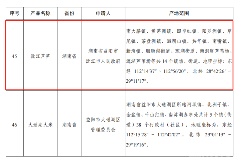 公告標(biāo)明“沅江蘆筍”的產(chǎn)地范圍為南大膳鎮(zhèn)、黃茅洲鎮(zhèn)、四季紅鎮(zhèn)、陽(yáng)羅洲鎮(zhèn)、草尾鎮(zhèn)、茶盤洲鎮(zhèn)、泗湖山鎮(zhèn)、共華鎮(zhèn)、南嘴鎮(zhèn)、新灣鎮(zhèn)、胭脂湖街道、瓊湖街道、南洞庭濕地保護(hù)和發(fā)展事務(wù)中心、漉湖濕地保護(hù)和發(fā)展事務(wù)中心等共14個(gè)鎮(zhèn)、中心、街道。地理坐標(biāo)為東經(jīng)112°14′37″~112°56′20″,北緯28°42′26″~29°11′17″。