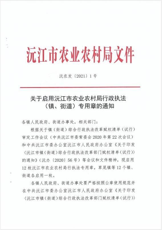 關于啟用沅江市農(nóng)業(yè)農(nóng)村局行政執(zhí)法(鎮(zhèn)、街道)專用章的通知