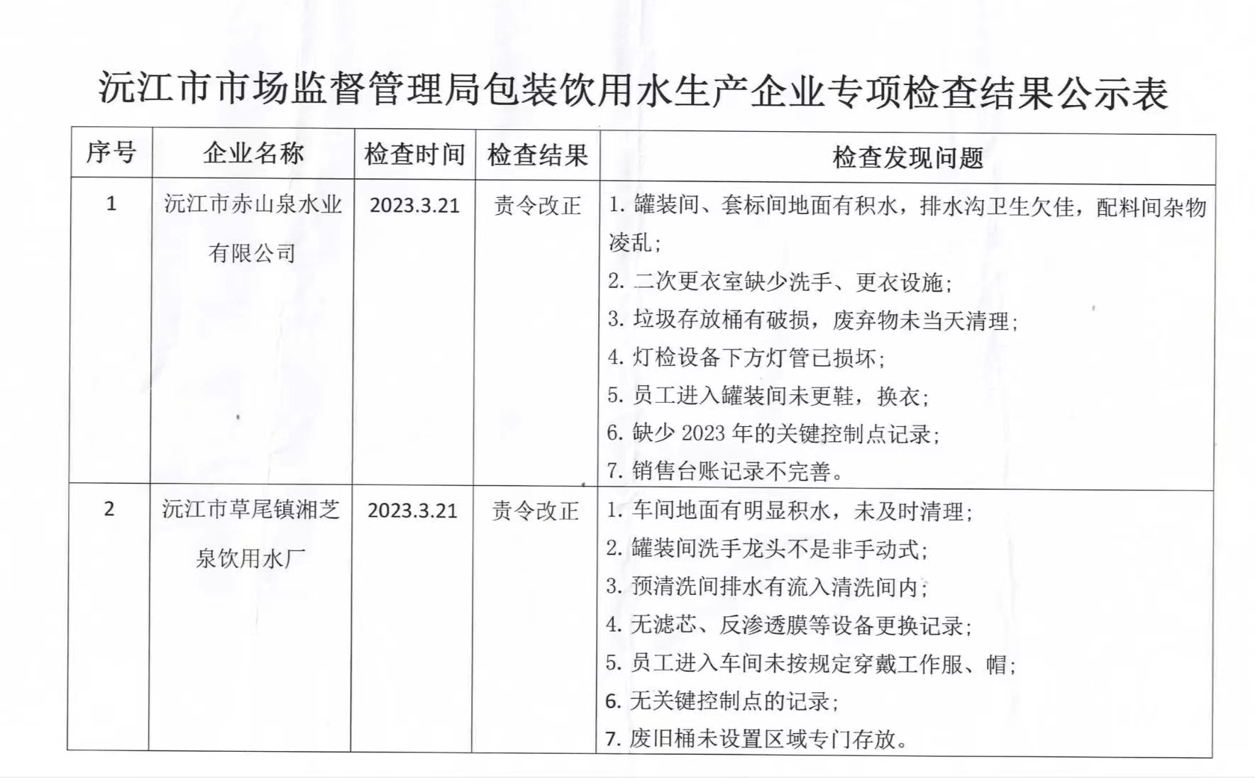 根據2023年湖南省食品生產安全監管工作要點,以及《益陽市市場監督管理局辦公室關于開展包裝飲用水銅綠假單胞菌不合格問題專項整治的通知》要求,2023年3月,沅江市市場監督管理局組織對轄區內兩家包裝飲用水生產企業進行專項檢查,專項檢查結果詳見附件。
