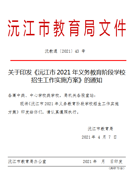 關于印發《沅江市2021年義務教育階段學校招生工作實施方案》的通知