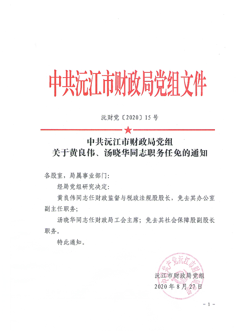 中共沅江市財政局黨組關(guān)于黃良偉、湯曉華同志職務(wù)任免的通知