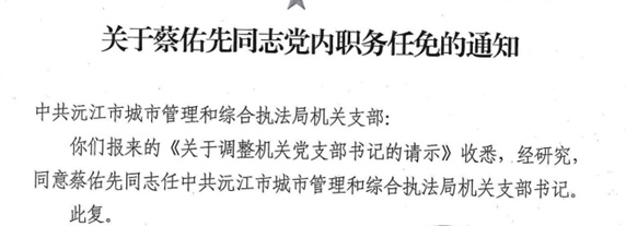 關(guān)于蔡佑先通知黨內(nèi)職務(wù)任免的通知