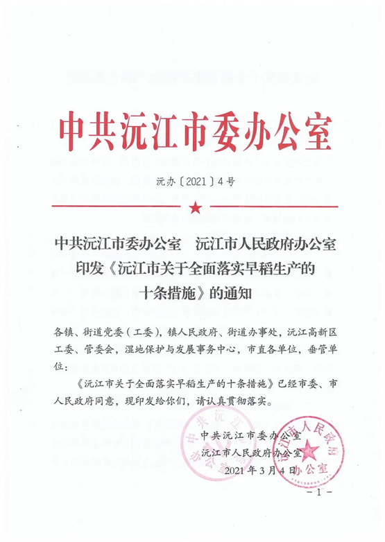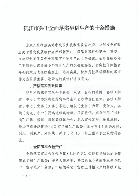 沅江市委市人民政府關于《全面落實早稻生產的十條措施》的文件