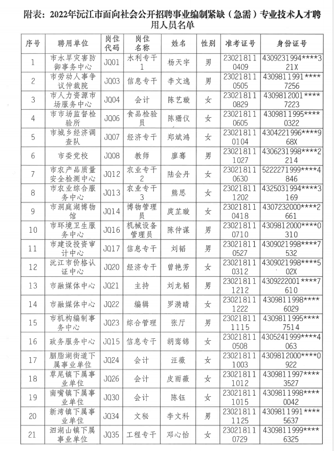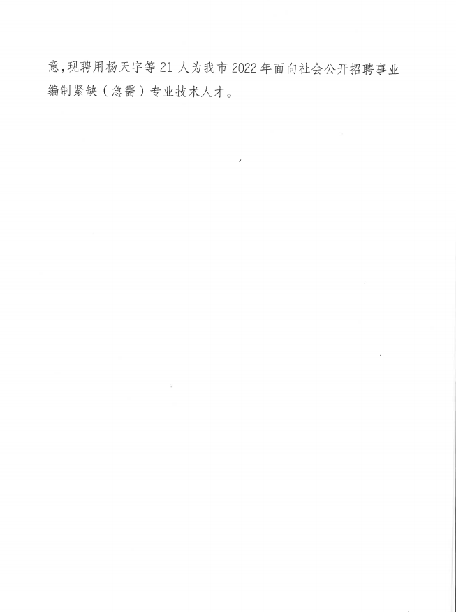 關(guān)于聘用楊天宇等21人為2022年面向社會(huì)公開招聘事業(yè)編制緊缺(急需)專業(yè)技術(shù)人才的通知