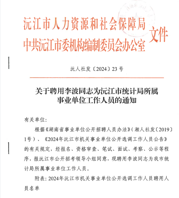 關于聘用李波同志為沅江市統(tǒng)計局所屬事業(yè)單位工作人員的通知