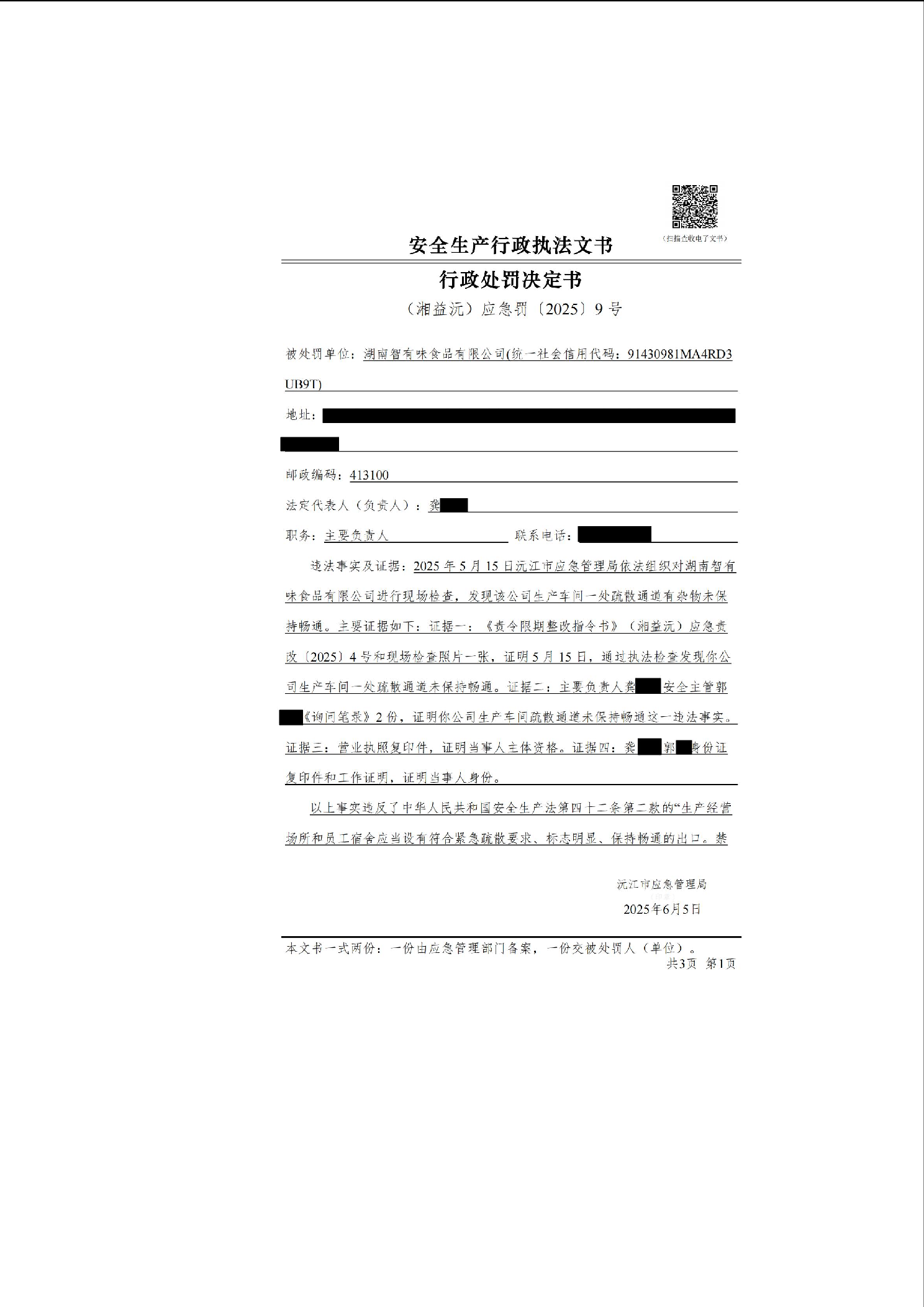 行政處罰決定書公示(湘益沅)應急罰〔2025〕9 號