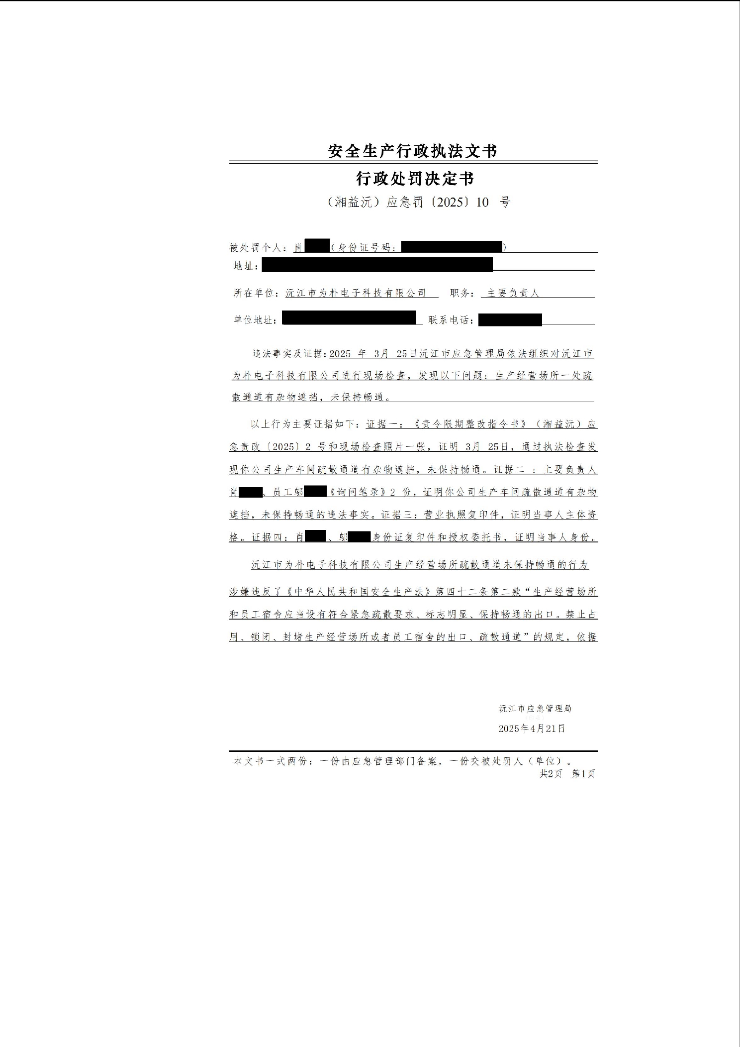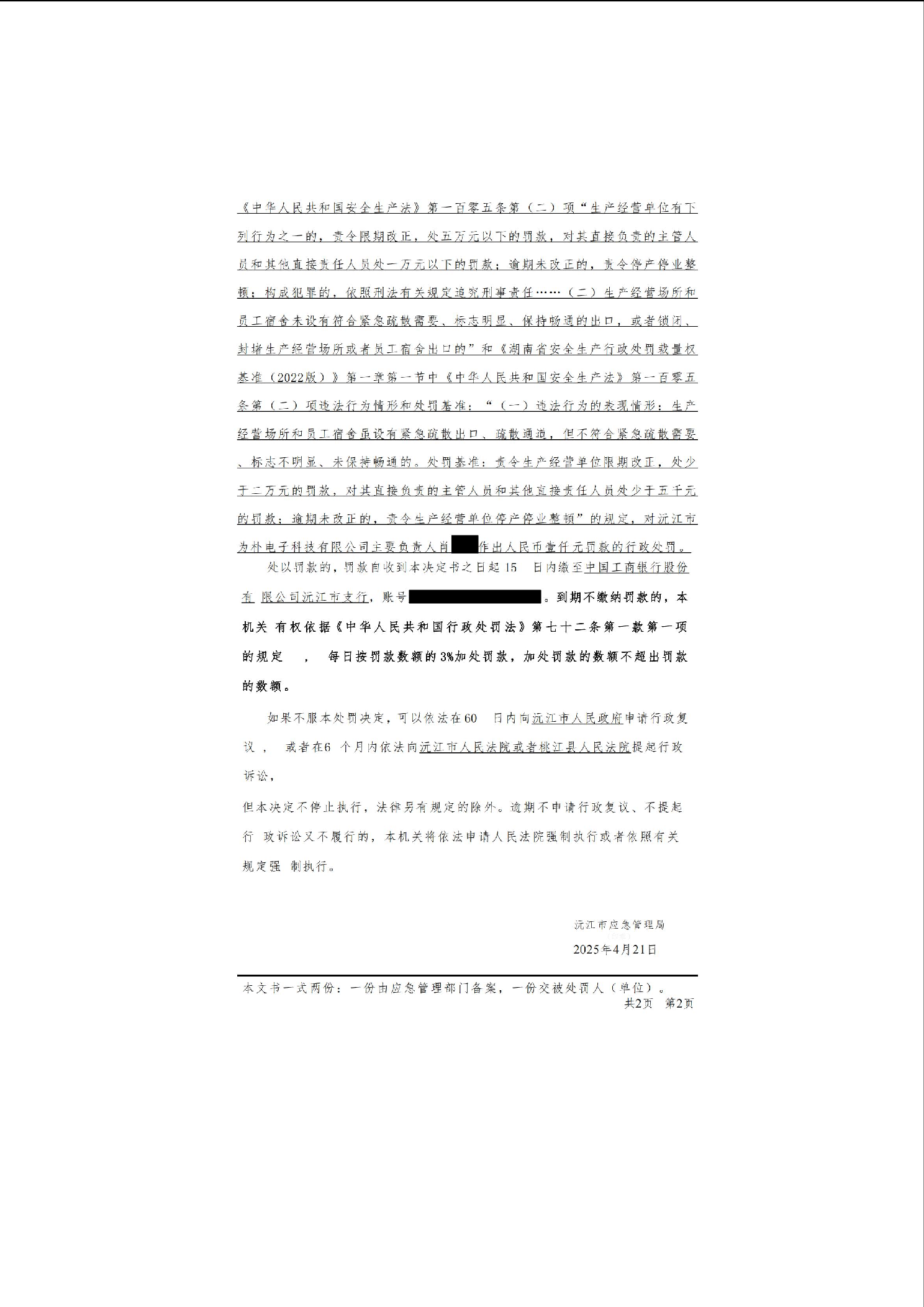 行政處罰決定書公示(湘益沅)應(yīng)急罰〔2025〕10號
