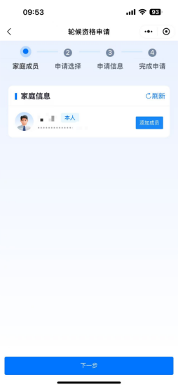九、家庭成員中如有共同申請人“添加成員”即可,獨(dú)自申請就點(diǎn)擊“下一步”。