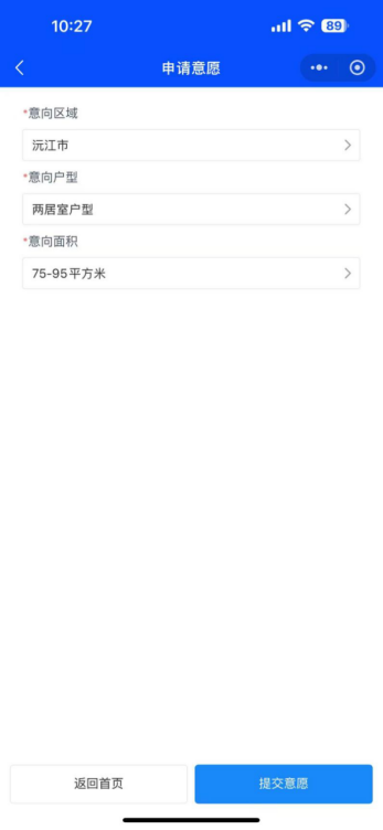 十三、針對申請人意愿選擇“意向區(qū)域、意向戶型、意向面積”,選擇完成后點(diǎn)擊“提交意愿”,完成所有操作。