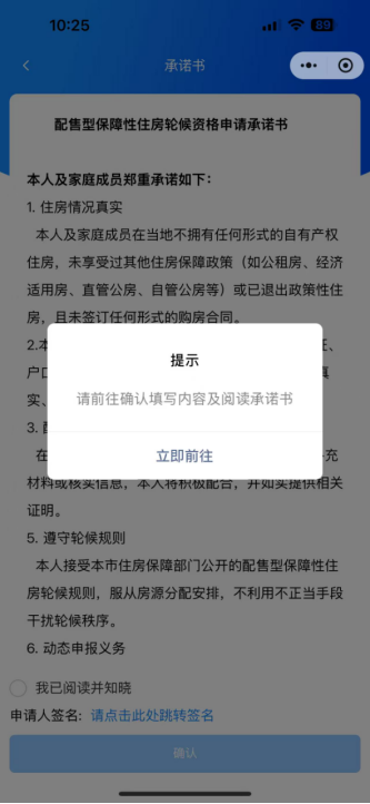 十二、點(diǎn)擊“立即前往”,接著返回到“承諾書”界面。勾選“我已閱讀并知曉”,并繼續(xù)點(diǎn)擊“請點(diǎn)擊此處跳轉(zhuǎn)簽名”,進(jìn)行申請人個(gè)人“簽名”,簽名完成后點(diǎn)擊確認(rèn)。