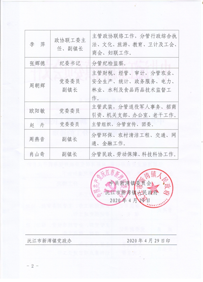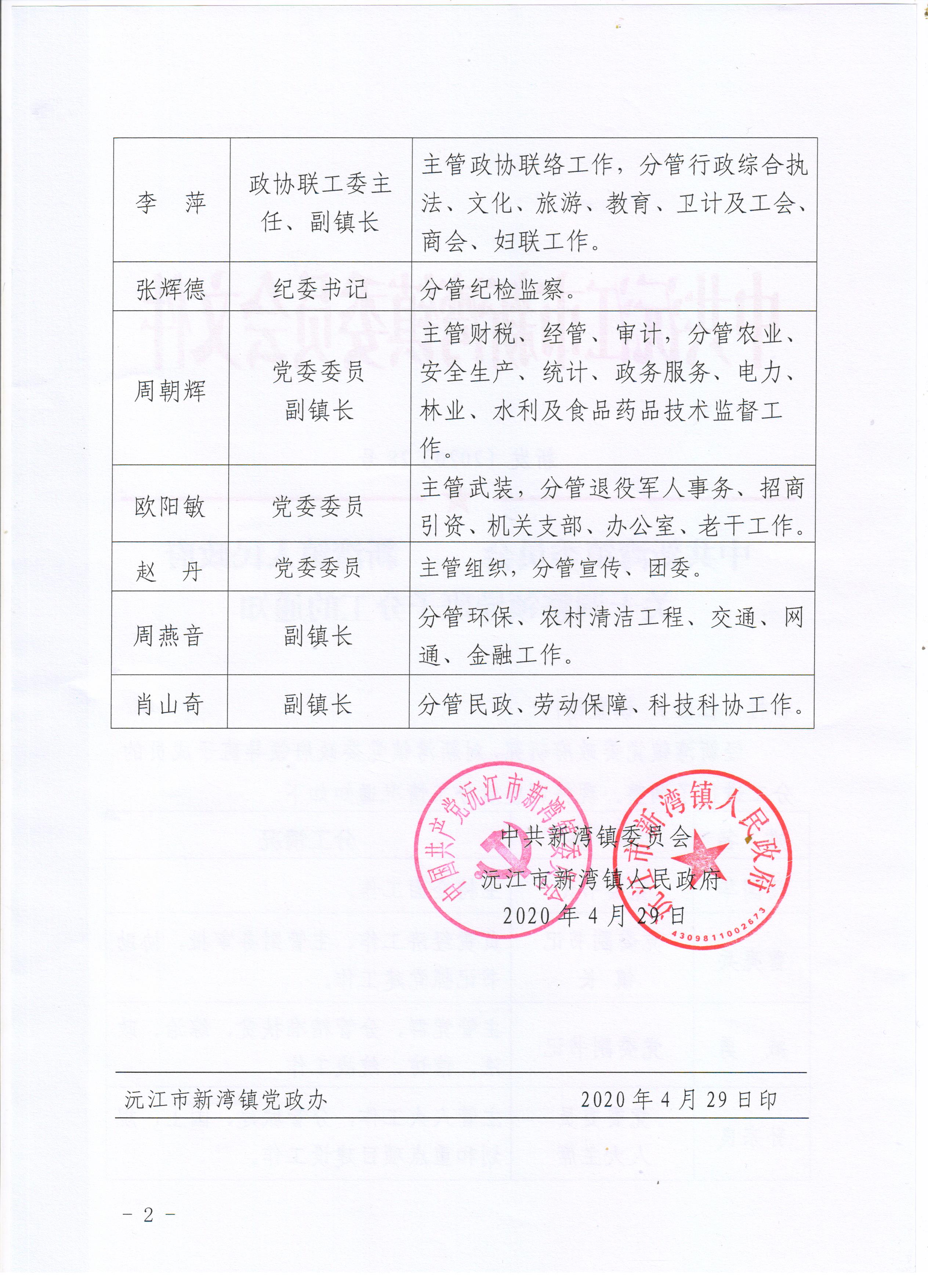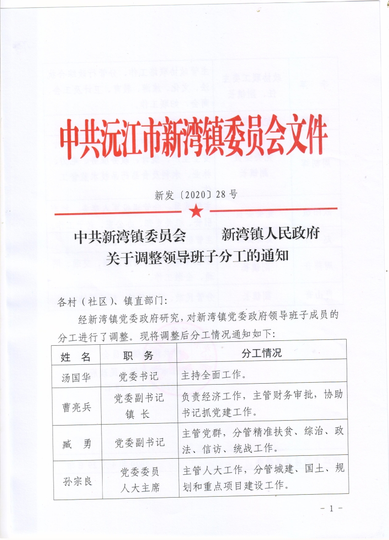 中共新灣鎮(zhèn)委員會(huì) 新灣鎮(zhèn)人民政府 關(guān)于調(diào)整領(lǐng)導(dǎo)班子分工的通知