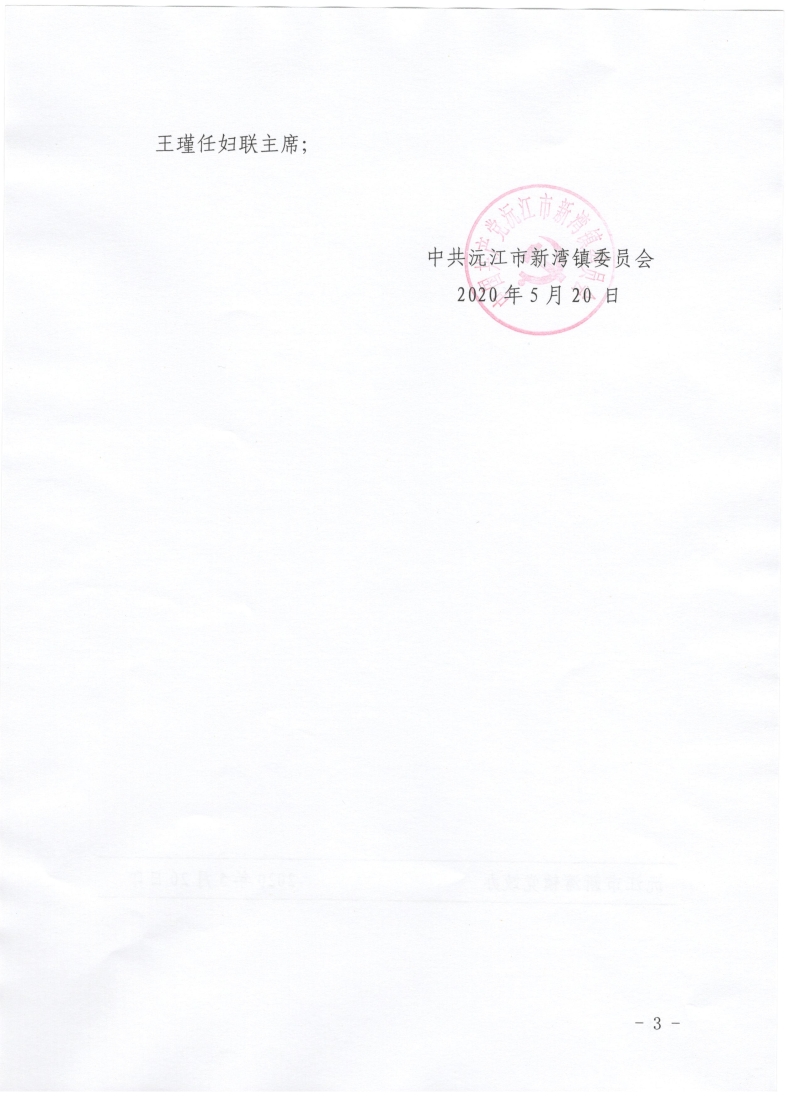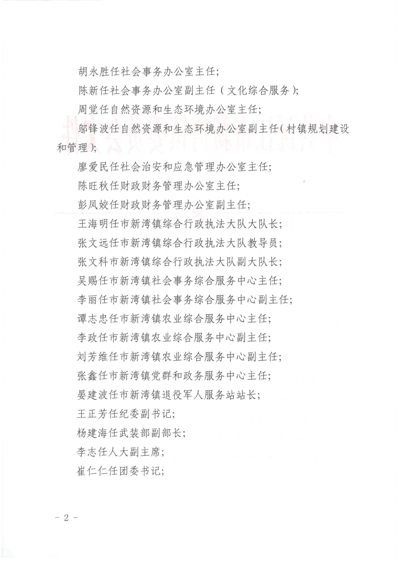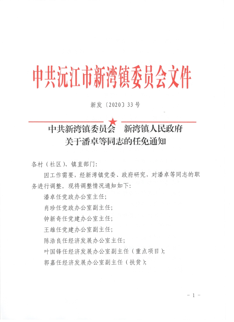 中共新灣鎮委員會 新灣鎮人民政府 關于潘卓等同志的任免通知