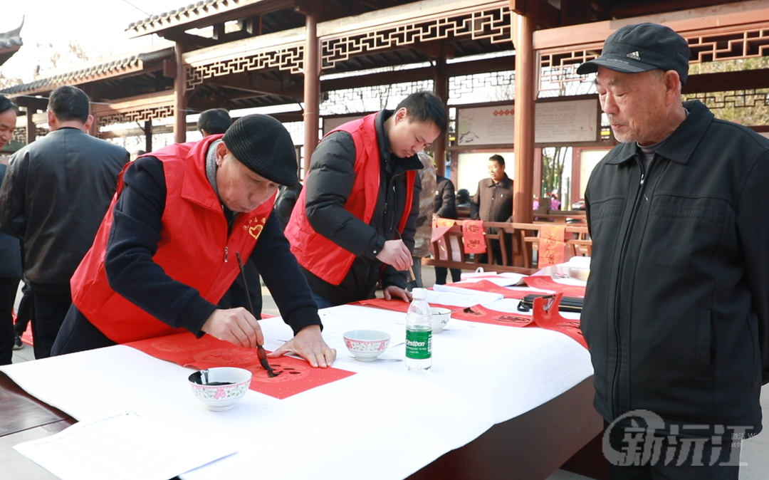 在七子浹村“村晚”活動(dòng)現(xiàn)場(chǎng),人聲鼎沸,彩球飄揚(yáng),大紅色的裝扮,讓現(xiàn)場(chǎng)顯得喜氣洋洋。村民們?cè)诎傩沾笪枧_(tái)上載歌載舞,優(yōu)美的音樂節(jié)奏、氣勢(shì)磅礴的鼓舞、富有喜感的花鼓戲、趣味的小品等,村民們惟妙惟肖的表演,讓臺(tái)下的人民群眾喜笑顏開,情不自禁拿出手機(jī)錄下精彩的瞬間。而在舞臺(tái)對(duì)面,來自市文聯(lián)的文化志愿者們則揮毫潑墨,現(xiàn)場(chǎng)為村民們書寫稱心如意的春聯(lián),讓整個(gè)“春晚”活動(dòng)顯得更加具有年味。