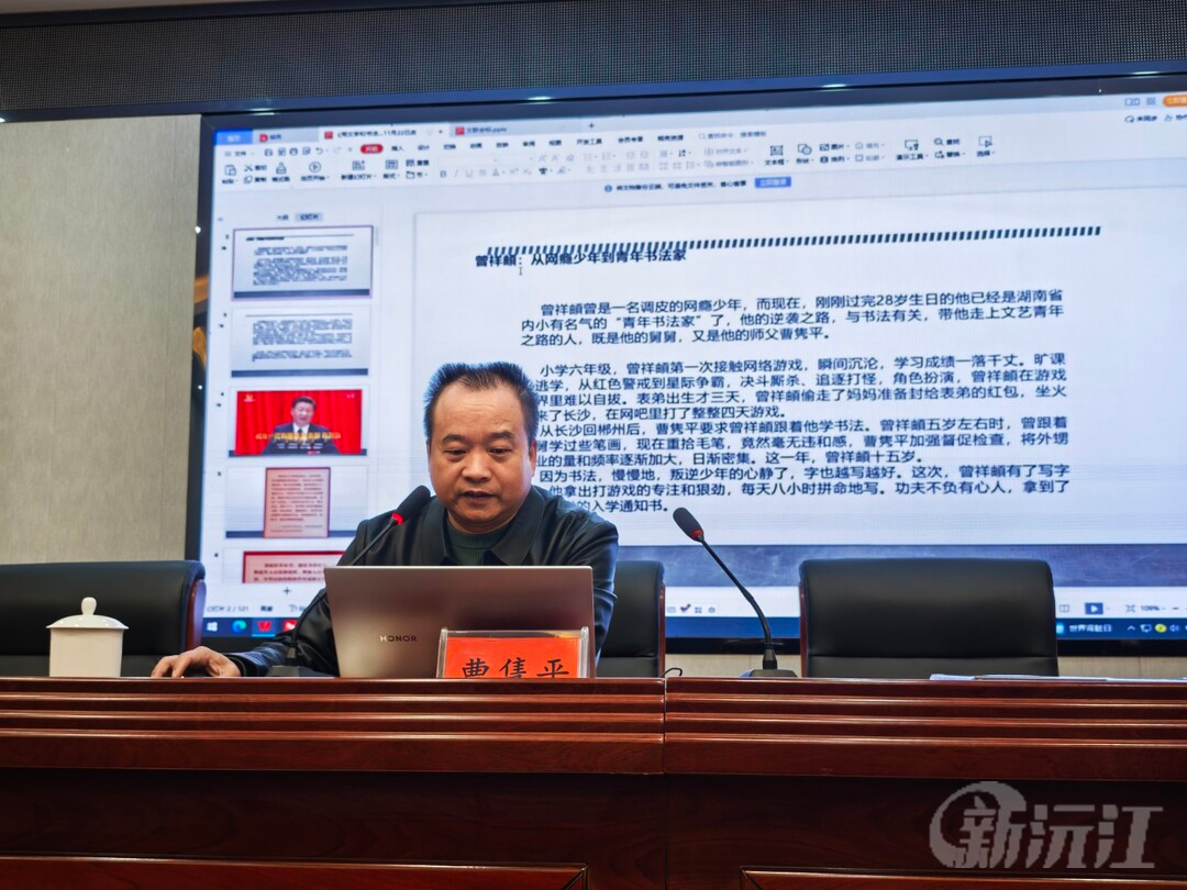 3月13日上午,由沅江市文學藝術界聯合會主辦的“文藝名家大講堂”在市醫保局會議室盛大開講;顒友埡鲜∥幕^副館長、知名書法家曹雋平擔任主講嘉賓,以“用文學和書法陶鑄中國人的精神家園”為主題,吸引了八十余名文藝愛好者、書法家以及市民熱情參與。