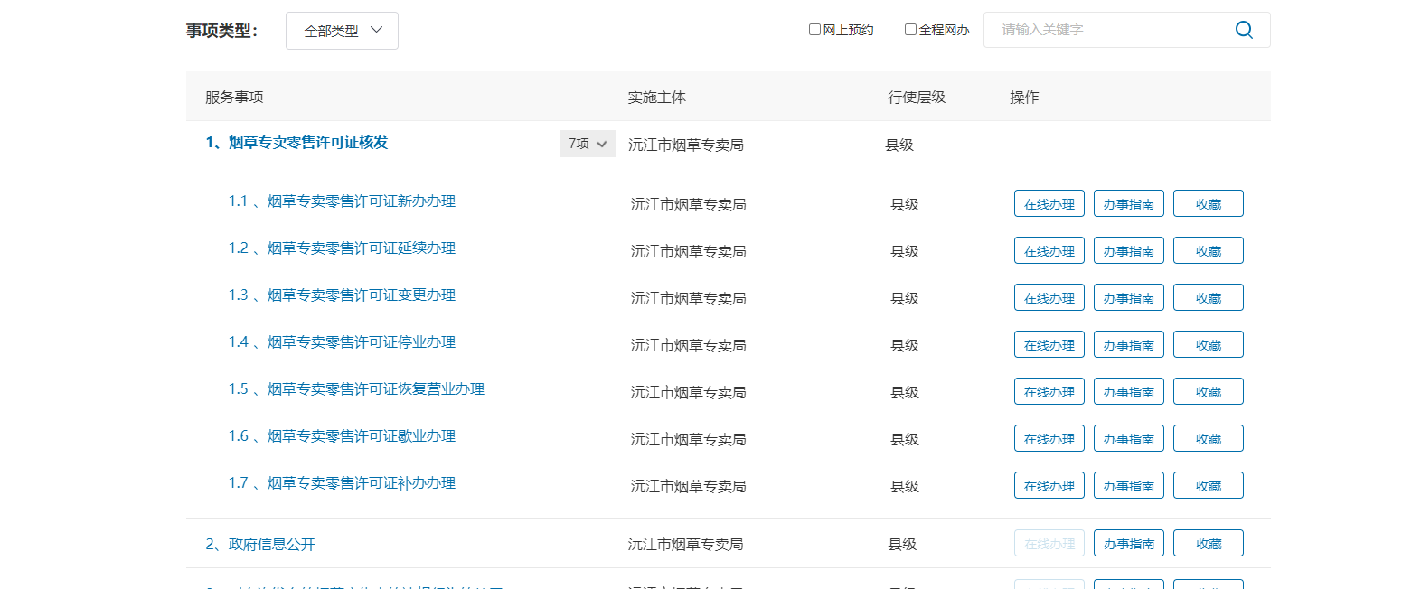 5.登錄“湖南省一件事一次辦”(http://zwfw-new.hunan.gov.cn)-切換沅江市-煙草專賣局辦理煙草證新辦、延續、變更、補辦、歇業、停業、恢復營業等有關業務。