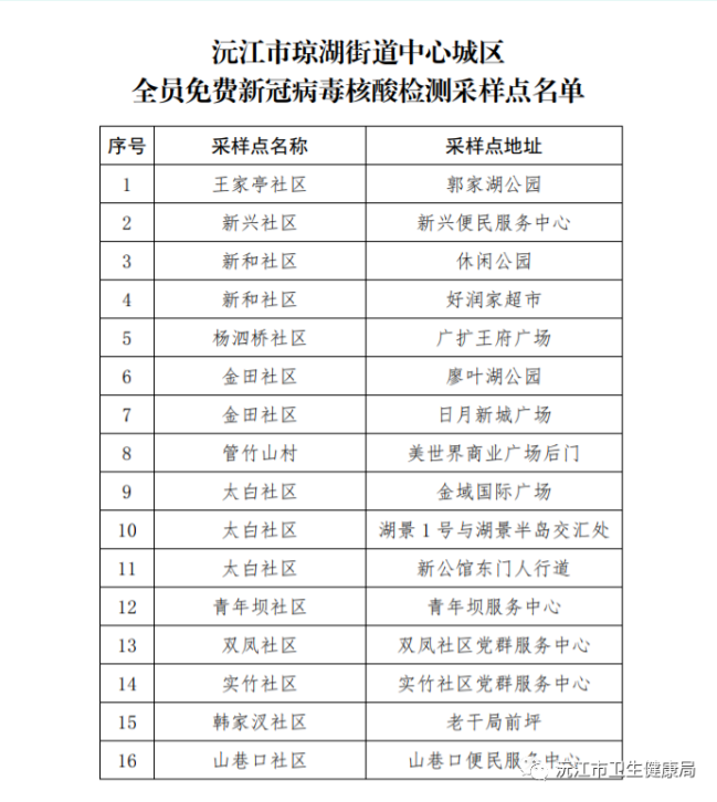 具體采樣點(diǎn)詳見附件《沅江市瓊湖街道中心城區(qū)全員免費(fèi)新冠病毒核酸檢測(cè)采樣點(diǎn)設(shè)置表》,請(qǐng)轄區(qū)內(nèi)居民按社區(qū)通知到指定地點(diǎn)采樣。