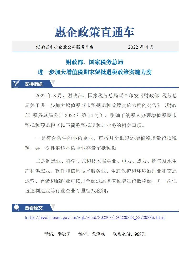 財政部、國家稅務總局進一步加大增值稅期末留抵退稅政策實施力度