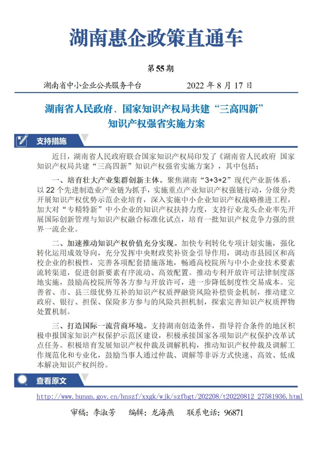 湖南省人民政府、國家知識產權局共建“三高四新”知識產權強省實施方案