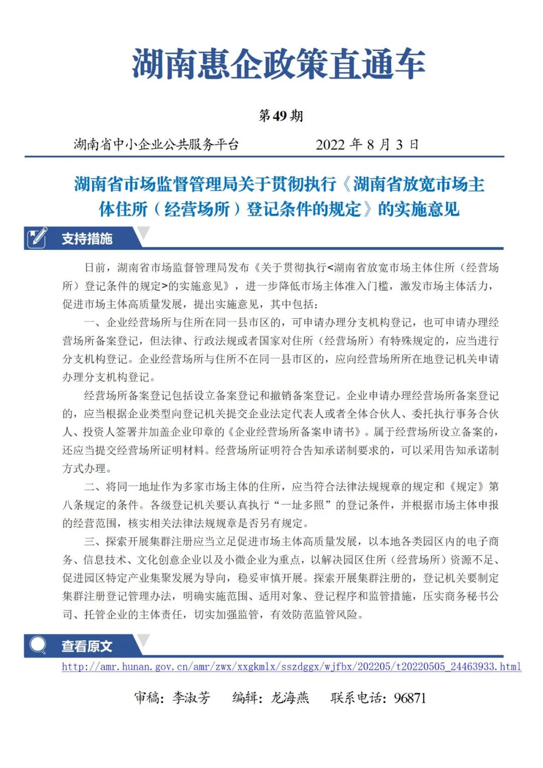 湖南省市場監(jiān)督管理局關于貫徹執(zhí)行《湖南省放寬市場主體住所(經(jīng)營場所)登記條件的規(guī)定》的實施意見