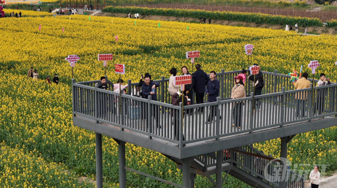 為了給游客提供更好的游玩體驗,基地內還建設了一系列配套設施。觀景平臺上,游客們可以俯瞰整片油菜花海,將美景盡收眼底;游步道蜿蜒在花海之中,方便游客近距離親近花朵;還有供游客休息的涼亭,以及各類打卡景點。