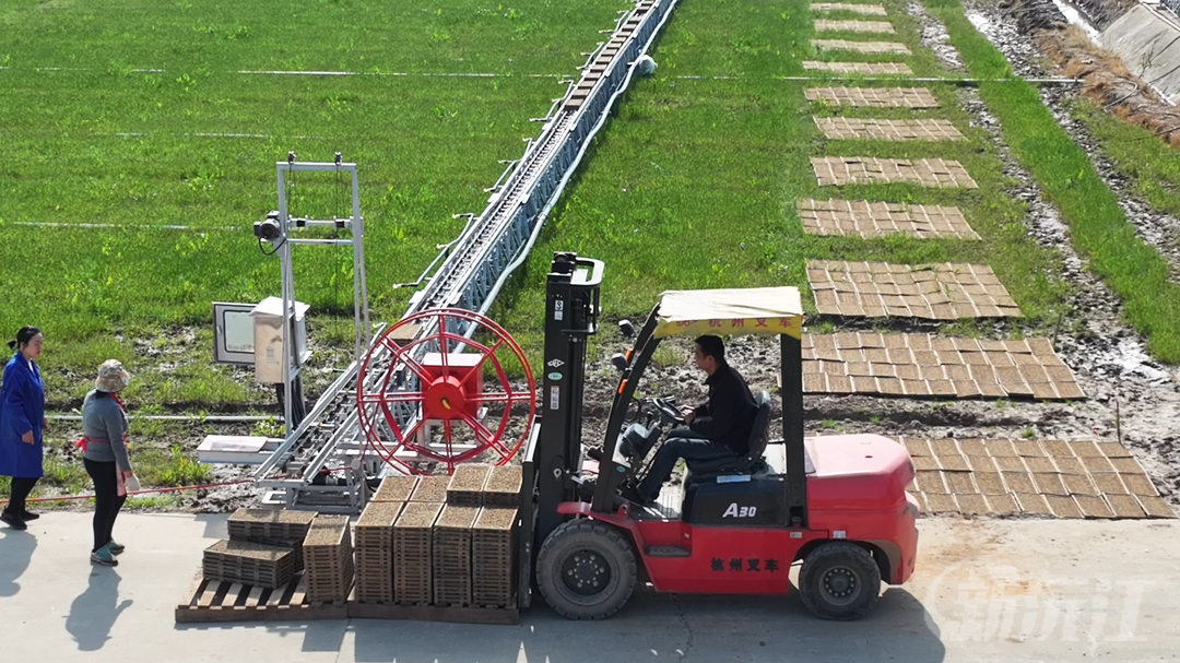 育苗車間外,8條銀色軌道固定在百畝秧田中。搭載著噴淋系統(tǒng)的“天車”運輸平臺,正將催芽秧盤以每秒0.8米的速度精準(zhǔn)投送至指定田塊。農(nóng)戶陳雙喜在育秧工廠工作已有數(shù)個年頭,每年的早稻育秧時,她與其他農(nóng)戶一起在秧田里擺盤,用原來的秧盤運輸流水線,秧田的芽床上只能擺放下四個秧盤,但現(xiàn)在有了這套田間物流系統(tǒng),人工不僅減少了,工作效率還大幅提高,秧田的芽床上能夠擺放五到六個秧盤,提高了秧田的利用率。