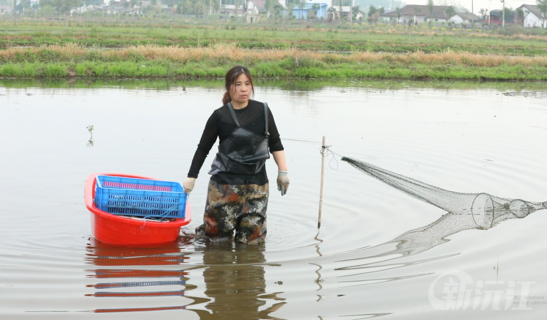 清晨五點,村民朱修與丈夫曹文明已穿梭在自家的稻蝦田間,熟練地收起著110多個“地籠王”。隨著一籠籠青殼紅螯的小龍蝦躍出水面,夫妻倆當日斬獲五六百斤鮮貨,按照當前每斤15-18元的市場價計算,今天收入頗豐。