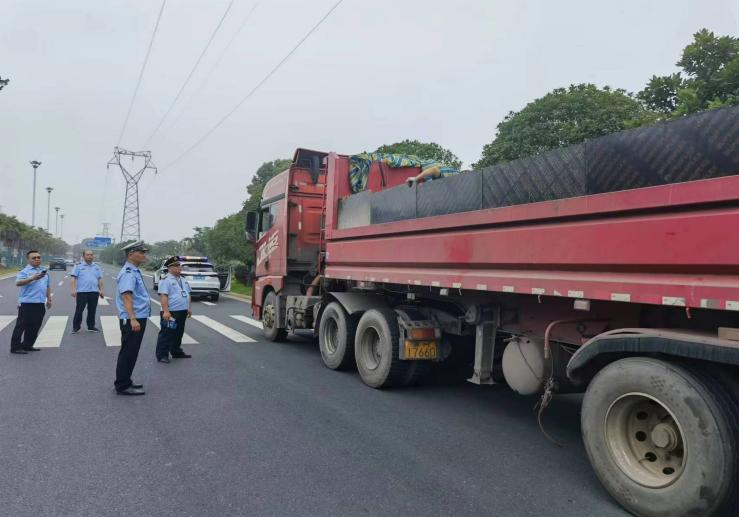 圖為執法人員責令駕駛員拆除車輛違法安裝的擋板并對其進行宣傳教育。