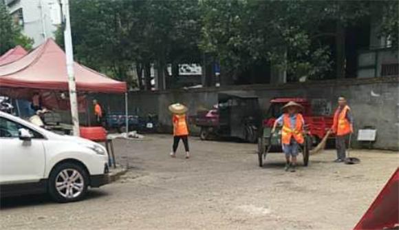 (環衛服務中心的工作人員與環衛工人一起并肩作戰)