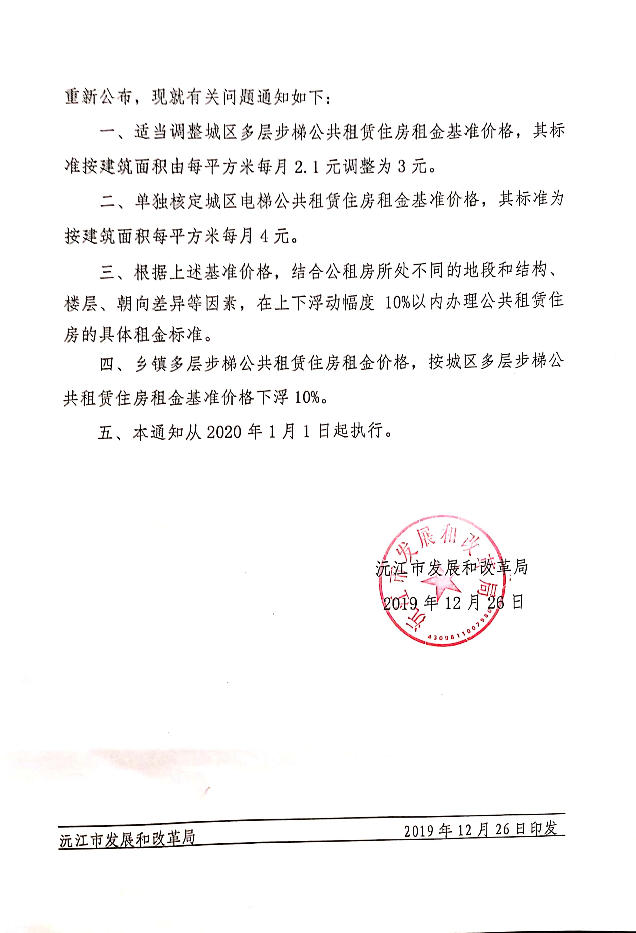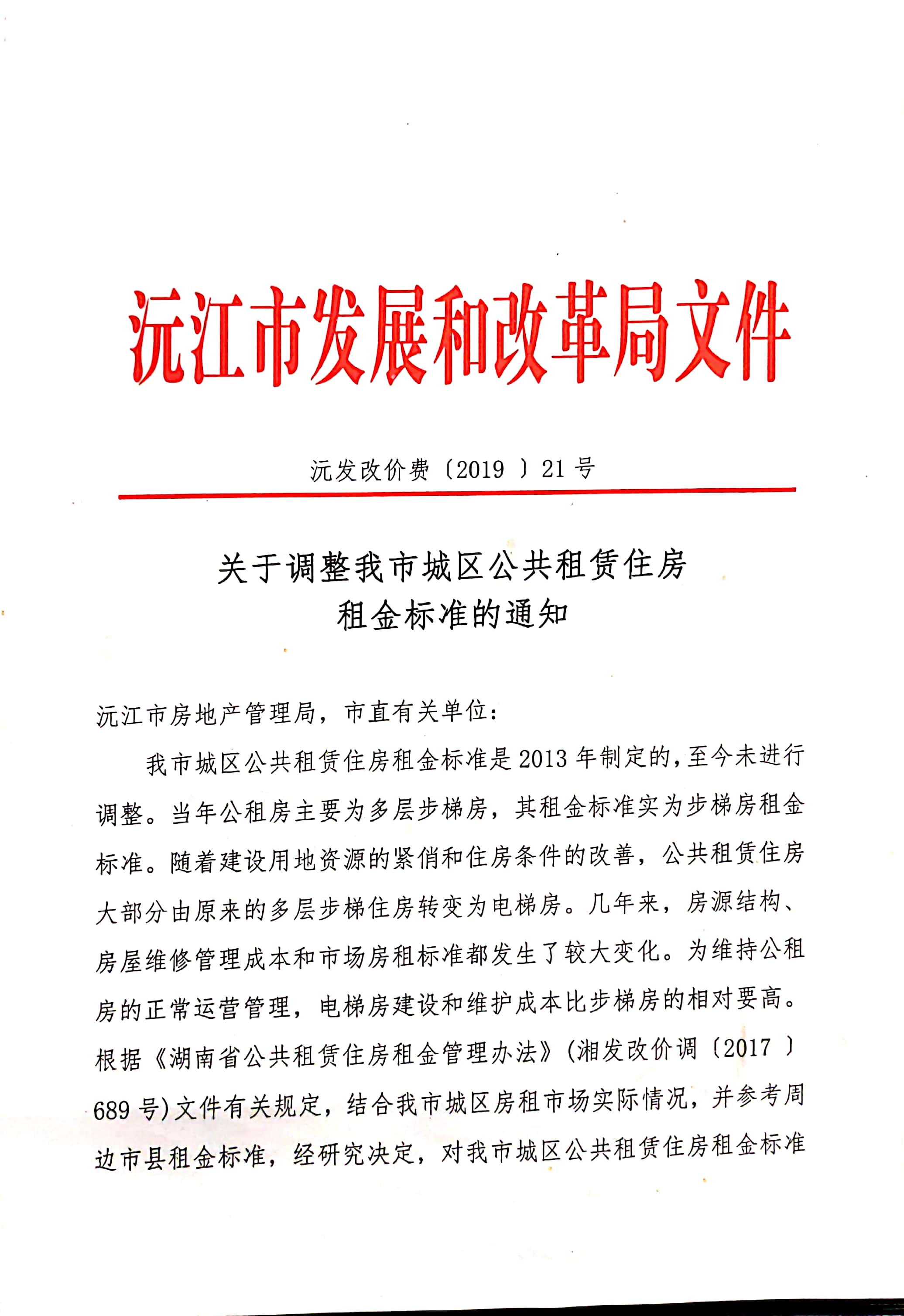 關(guān)于調(diào)整我市城區(qū)公共租賃住房租金標準的通知(沅發(fā)改價費【2019】21號)