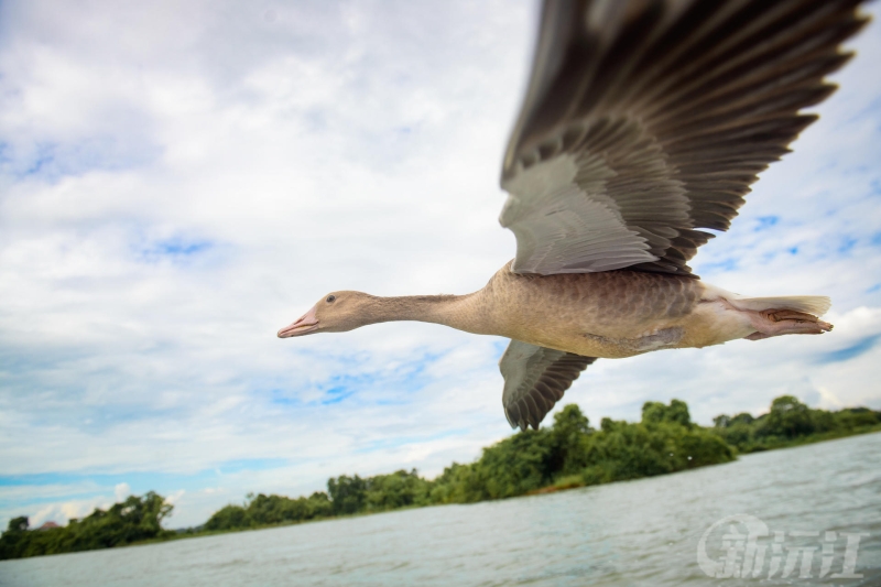 碧波蕩漾的小黃家湖上,晨飛的大雁群正展現出自然的靈性,二十余只鴻雁振翅掠過水面,成群結隊地繞著船舷盤旋飛舞,灰褐色的羽翼在陽光下泛著金屬光澤,時而俯沖貼近水面劃出漣漪,時而振翅高飛形成環形隊列,仿佛在為訪客上演一場自然饋贈的空中芭蕾,雁鳴聲清脆悠遠,在湖面久久回蕩。
